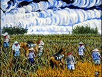 Cane WorkersThis oil on canvas evokes a journey back in time to a by gone era - where old Hawaii seemed new, and was richly saturated in a diverse melting pot of culture whose roots were buried deep in the sugarcane fields of yesteryear. Today sugarcane workers can still be seen tending their crops, under a vibrant Maui sky. | click for larger |